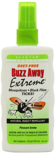 Studio : Quantum Publisher : Quantum Binding : Health and Beauty Product Description Natural insect repellant. Repels mosquitoes, gnats, blackflies and ticks. 4-8 hour protection. Sweat proof and waterproof. Pleasant aroma. Long-lasting and potent, Buzz Away Extreme repels mosquitoes, gnats, blackflies and no-see-ums for up to 4-8 hours. It even provides protection from ticks for 2 hours. For maximum protection reapply every 3.5 hours. 0