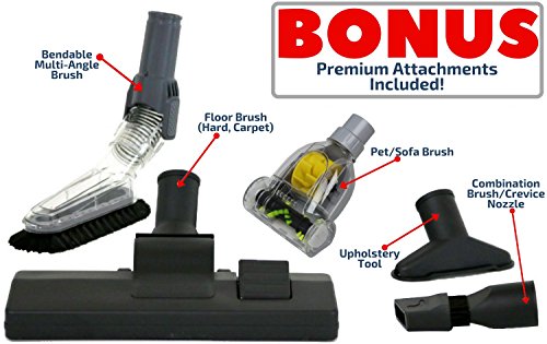 This small, but powerful vacuum is powered by 1400-Watts, using nonstop suction to pick up debris in one go, so you save time, energy, and electricity. It also comes with many premium attachments to help you clean different surfaces with ease. These attachments include: floor brush (hard floors, rug/carpet), combination bristle brush/crevice nozzle (corners, cracks), upholstery tool, a sturdy metal telescopic wand, sofa/pet brush, and a bendable, multi-angle brush (tall ceilings, tops of furniture, lighting). Its stylish design flatters its surroundings and comes in 4 colors: black, red, green, and orange.