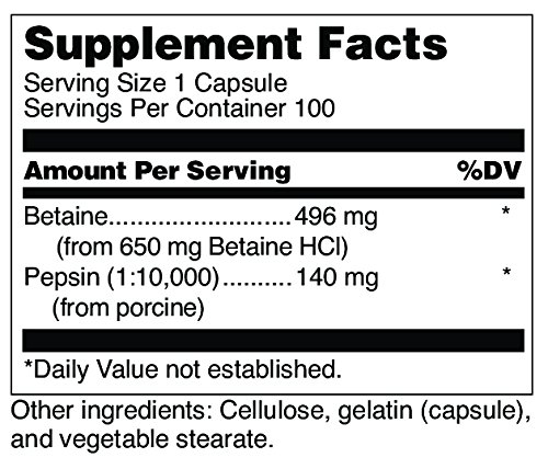 Betaine Plus ®, provided by Douglas Laboratories, supplies 650 mg of Betaine HCl and 140 mg of Pepsin in each easy to swallow capsule.