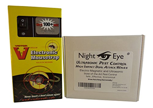- Feature : VICTOR ELECTRONIC MOUSE TRAP and ULTRASONIC MOUSE REPELLER 2 Piece Bundle. Electronic mouse trap uses advanced smart circuit technology to sense when a rodent enters the unit. Then High Voltage shock kills the mouse in 5 seconds. Built in safety switch and tunnel design protect kids and pets. Beveled columns hold the mouse in place for a 100% kill rate. NO ESCAPES. / EASY TO USE Simply bait with peanut butter, turn on and empty Lid flips open to keep hands away from rodent..NO NEED TO TOUCH THE MOUSE. / ULTRASONIC MICE REPELLER, by NIGHT-EYE help assure that mice do not return to your home. Using high-tech ultrasonic and electromagnetic sound it creates an environment that the mice do not want to enter. / HIGH-TECH PEST CONTROL electronic pest repellers are proven to work aganist a wide range of rodents and bugs, cockroaches, mites, fleas, ants, The ultrasonic and electromagnetic sound waves drive the pest away, It works for pennies a day, 24 hours a day / RODENT CONTROL, MOUSE CONTROL, Use the high-tech approach to solve your pest control problems.