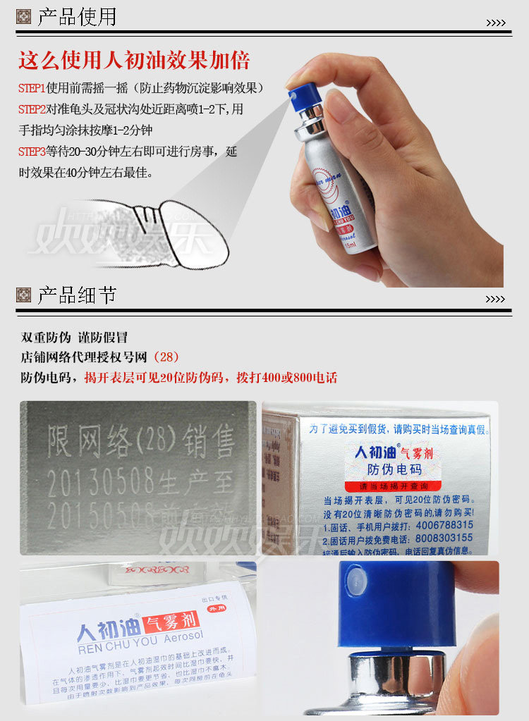 Usage: Spray on 30 minutes before intercourse glans penis and Coronal section (Shake before use, to prevent drug precipitation affect the results) within 30-60 minutes after spraying efficiency, bathe it will not affect results. (Spray one or two of buttons, such as ineffective, may be due to individuals increase product usage) Note: This product is a significant delay effect, beginning with do not spray too much, oh! The reason you know!
