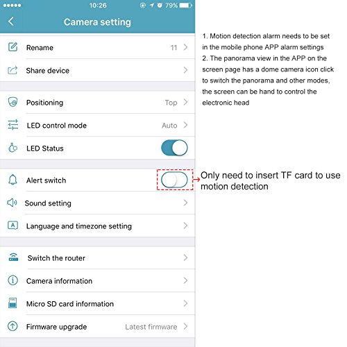 - ►NOTE:1. motion detection alarm needs to be set in the mobile phone APP alarm settings; 2. the panorama view in the APP on the screen page has a dome camera icon click to switch the panorama and other modes, the screen can be hand to control the electronic head.