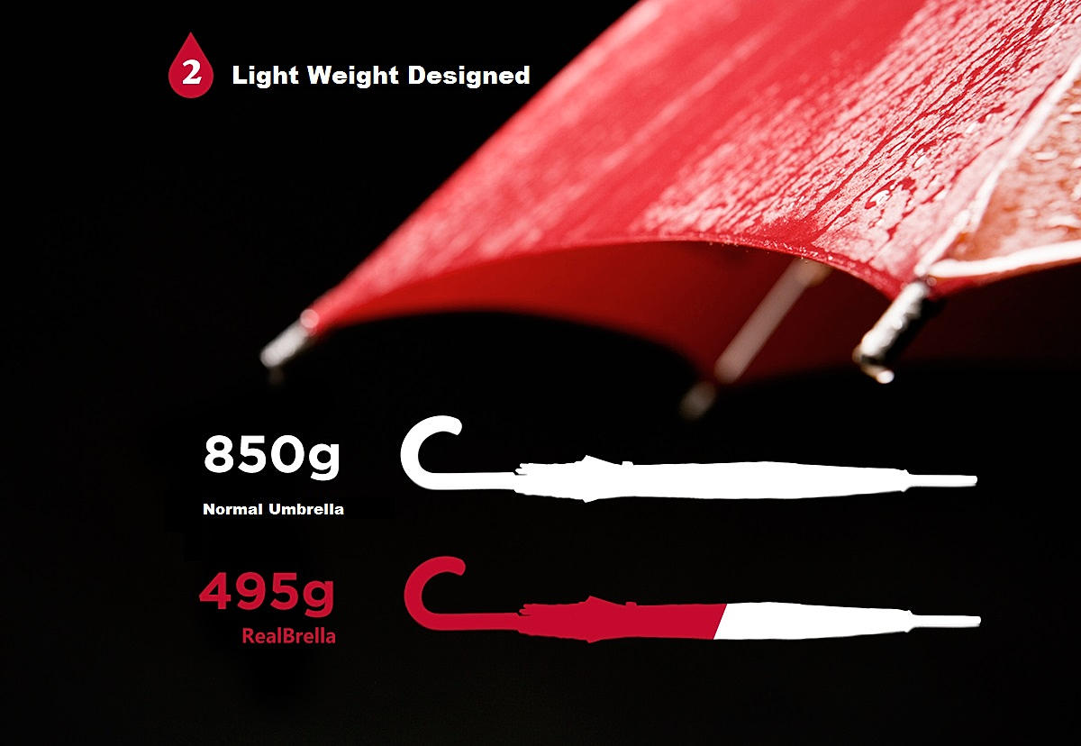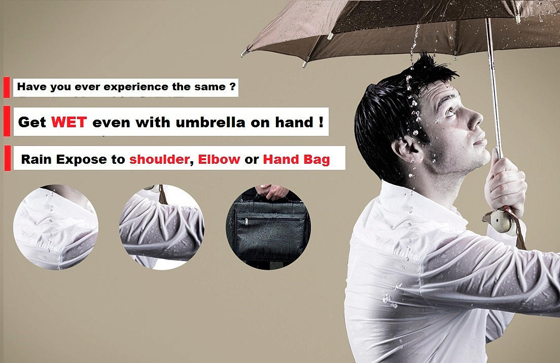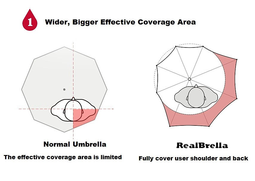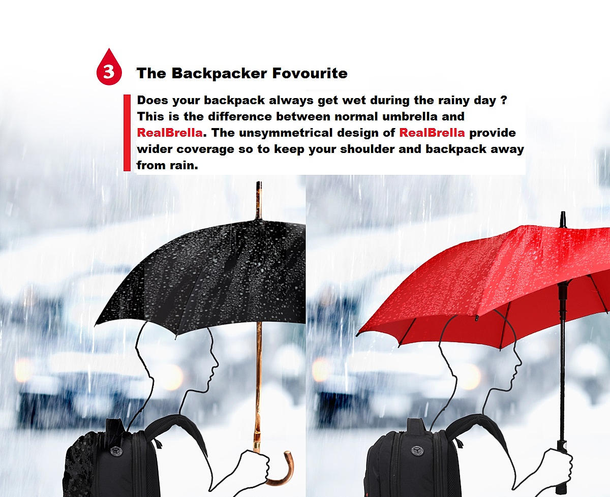 You must have encounter a wetting shoulder during a rainy day even trying to cover yourself with an umbrella couldn't help ? The new innovative RealBrealla was designed to protect your shoulder and backpack from getting wet during a rainy day. Compare with the normal umbrella, The RealBrella showed unsymmetric design and expand its real and side area to provide extra 20cm coverage so to protect user from rain exposure, and what is even more ? It only weight 495g !