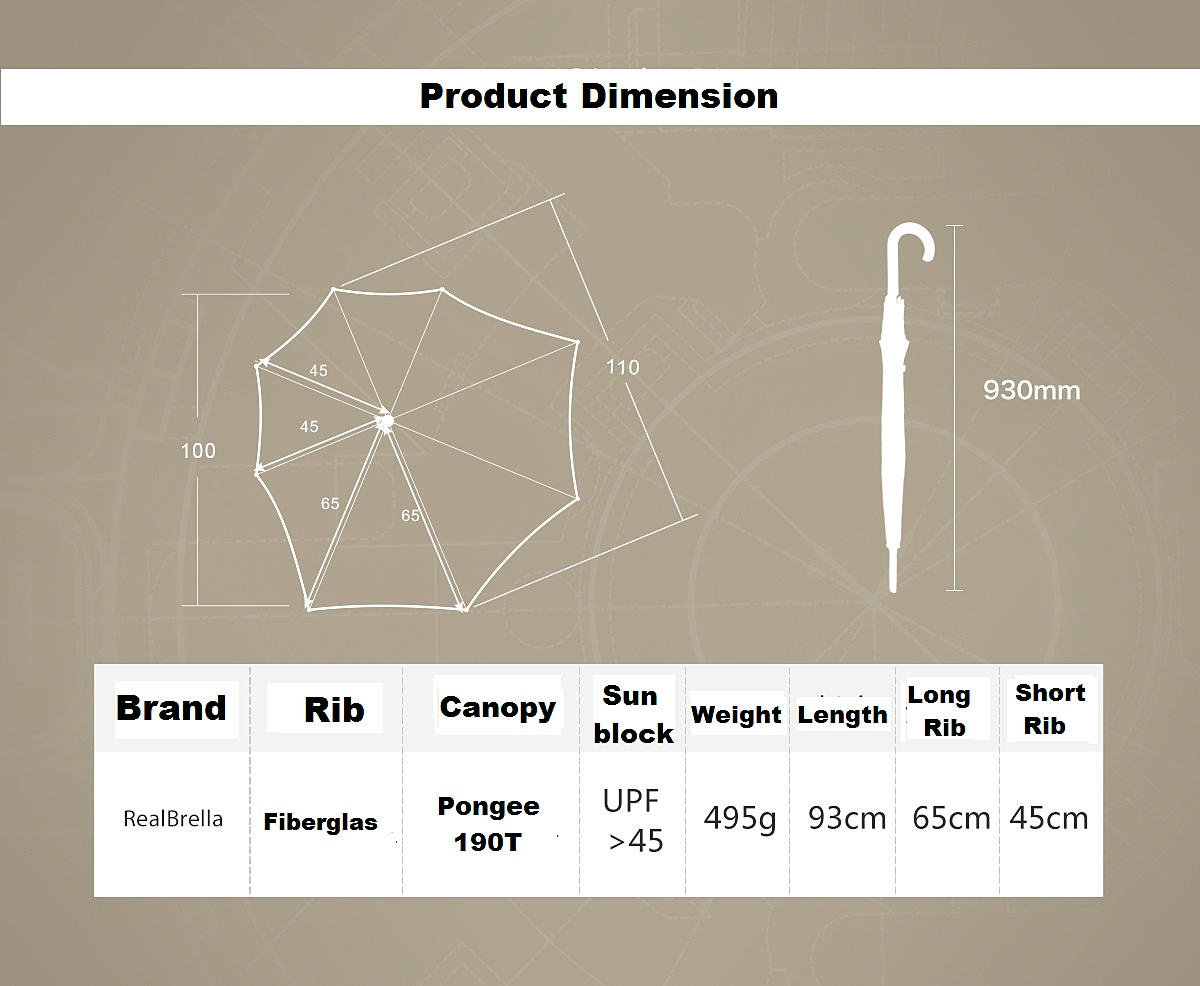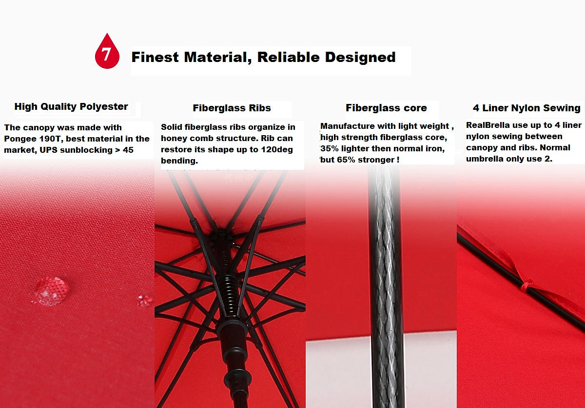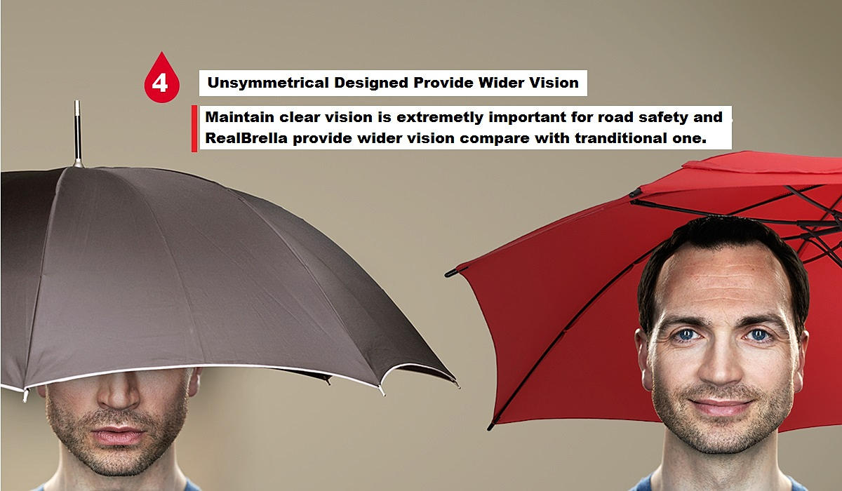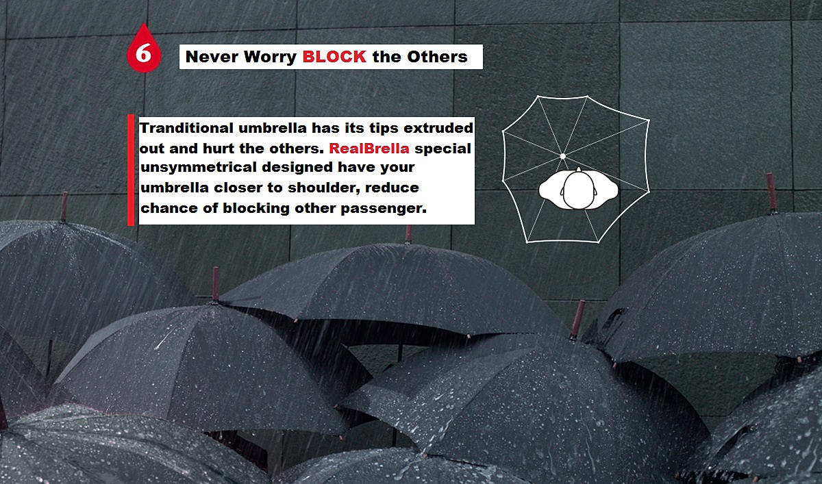 You must have encounter a wetting shoulder during a rainy day even trying to cover yourself with an umbrella couldn't help ? The new innovative RealBrealla was designed to protect your shoulder and backpack from getting wet during a rainy day. Compare with the normal umbrella, The RealBrella showed unsymmetric design and expand its real and side area to provide extra 20cm coverage so to protect user from rain exposure, and what is even more ? It only weight 495g !