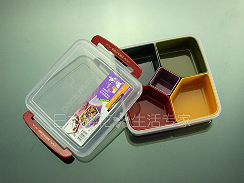 Dimension 9in Sq. x 2-3/4in H * Capacity: 2.5 Liter * Medium Container 400ml, Smalll Container 100ml * Snap on Lid * 5 Removable small box fits into the big box. * Inner Lunch Box is Microwave or Dishwasher Safe * Outer Box not Recommend for Microwave. * Made in Japan by Inomata