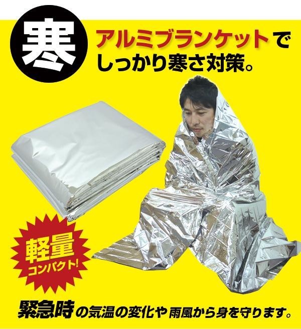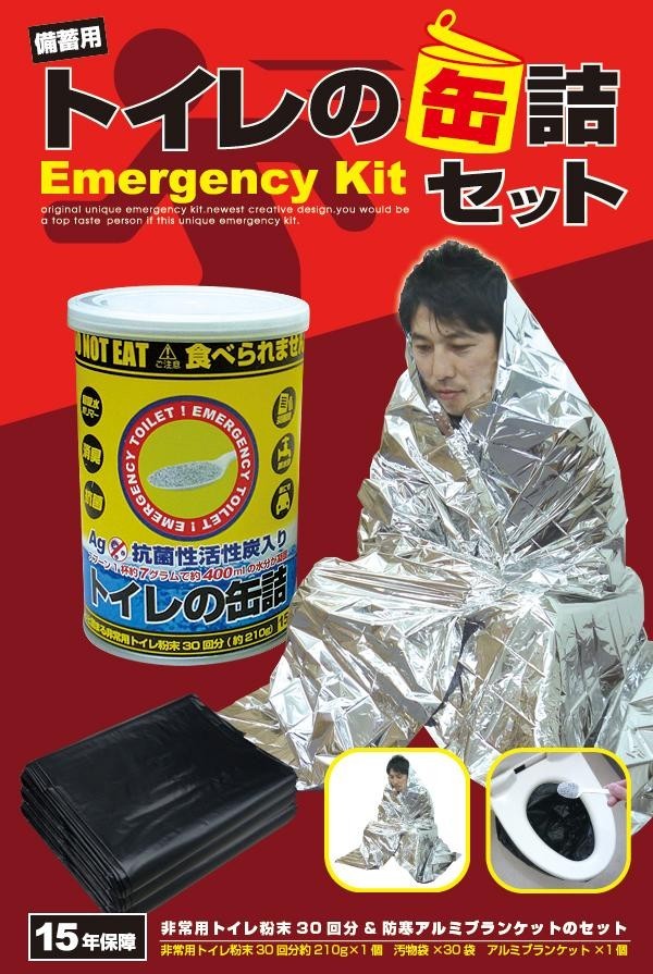 粉末タイプの非常用トイレ(凝固剤)を缶詰に密封した「トイレの缶詰」と「汚物袋」、防寒効果で体温低下から身を守る「アルミブランケット」を保管しやすいようにコンパクトな箱にセットした防災セットです。 |