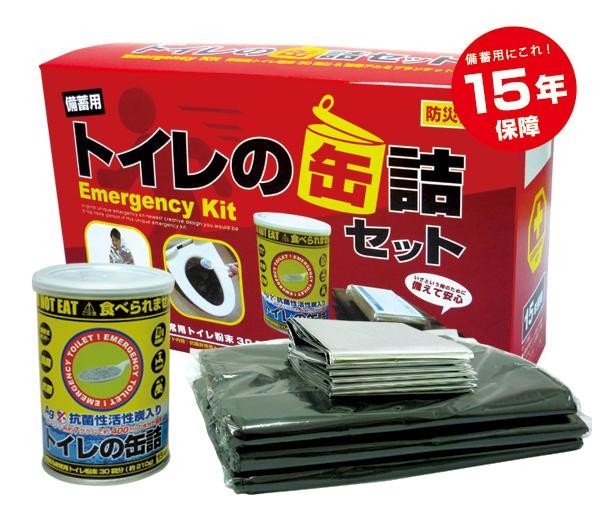 | 粉末タイプの非常用トイレ(凝固剤)を缶詰に密封した「トイレの缶詰」と「汚物袋」、防寒効果で体温低下から身を守る「アルミブランケット」を保管しやすいようにコンパクトな箱にセットした防災セットです。 |