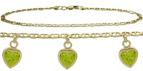 -. Title : 10K Yellow Gold Mariner Anklet with 2.10 Carat Genuine Peridot Heart Charm
