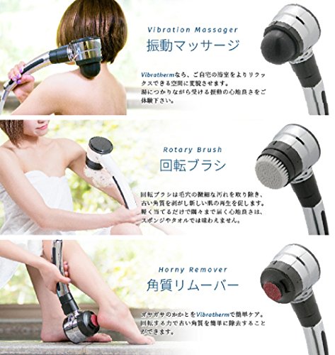 가정의 샤워 헤드를 갈아 붙이는 것만으로,지금 까지 없었던 샤워 라이프가 실감으로 옵니다.샤워 만이 아니다,유수 구동 방식 채용에 의해 마음 든든하 회전으로 스핀 바디 브러시,스핀 리무버,진동 안마기의 어태치먼트를 구동합니다. (특허 신청 중) 전기를 필요로 하는 제품(전동 브러시,전동 각질 깎고, 전동 안마기등)에 대해서 전기를 사용 하지 않는 욕실 기구를 목적으로 해 탄생 한 제품이《비부라테루무》입니다.샤워 타임에 바디 brushing,각질 케어,맛사지가 즐길 수 있다.전기 불요에 1대 4역할 !! 그것이《비부라테루무》입니다.Vibratherm New Shower Life 의 개막입니다.