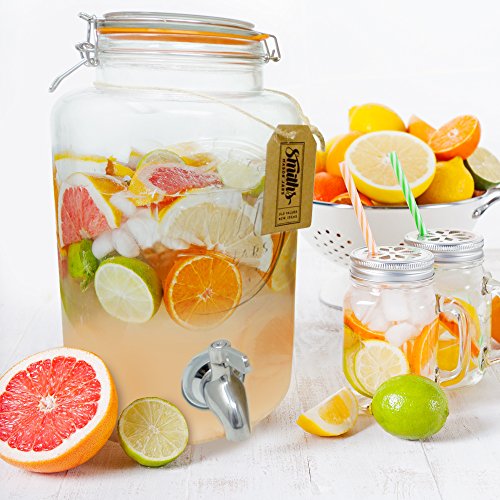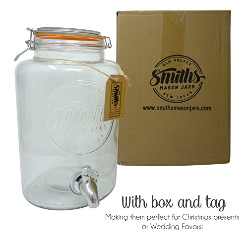 5-Liter Smiths Mason Jar Glass Drink Dispenser Treat your guests to their favorite summer beverages with our standard Smiths mason jar drink dispenser. Whether you're hosting an event or are whipping up a big batch of sweet tea, fresh lemonade or a refreshing infused water, you'll need a drink dispenser that's up to the task. So why not have a designated drink dispenser on hand? This 5-liter handsome smiths mason jar is ideal for all types of cold beverages. Shaped to perfection. Base provides maximum stability. Featuring a dispensing stainless steel spigot. Crafted from the high-quality, durable glass. Our Smiths mason jar has a removable wire mesh which is easily removable, and the orange cap can be removed too for ensuring free flow and no vacuum. This drink dispenser is an established and classy way to serve drinks. Glass enhances and preserves the beverages aromas and flavors. Elegant look adds to any events aesthetics. This jar is also perfect for Christmas, Birthday Gifts, Wedding Party, Housewarming. This beverage dispenser, will help you enjoy your favorite drink, be just a glass of water, or a cold lemonade, with juice, punch, soda or large, iced, tea. This mason Jar Drinks Dispenser has a metal spigot / tap mason, jar, party, tap, replacement, for, gallon ensuring you enjoy your sangria, or iced cocktail, to enjoy best use with our Mason Jar Mugs by Smiths Mason Jars. ASIN:- B01JZA8GVA