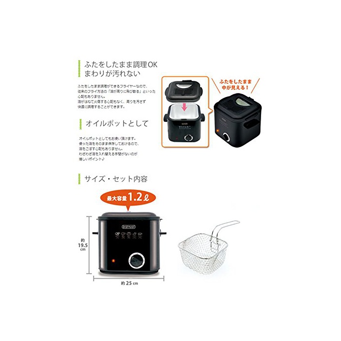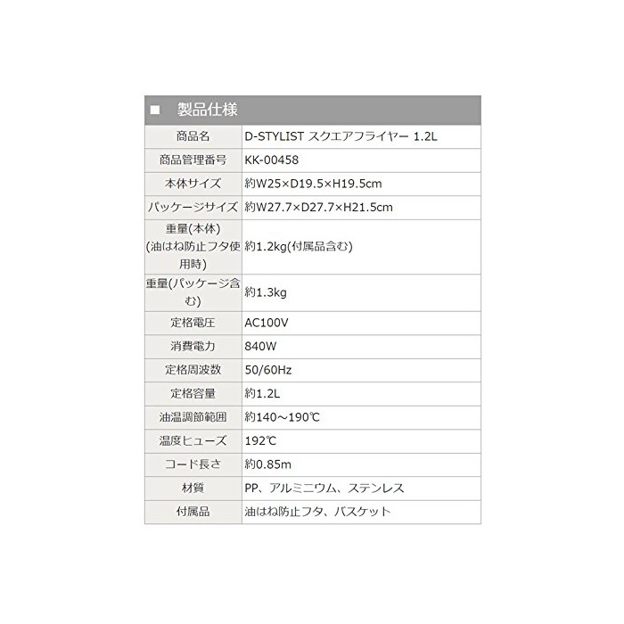 원본상품명: 電フライヤ 卓上フライヤ 家庭用 D-STYLIST スクエアフライヤ 1.2L KK-00458