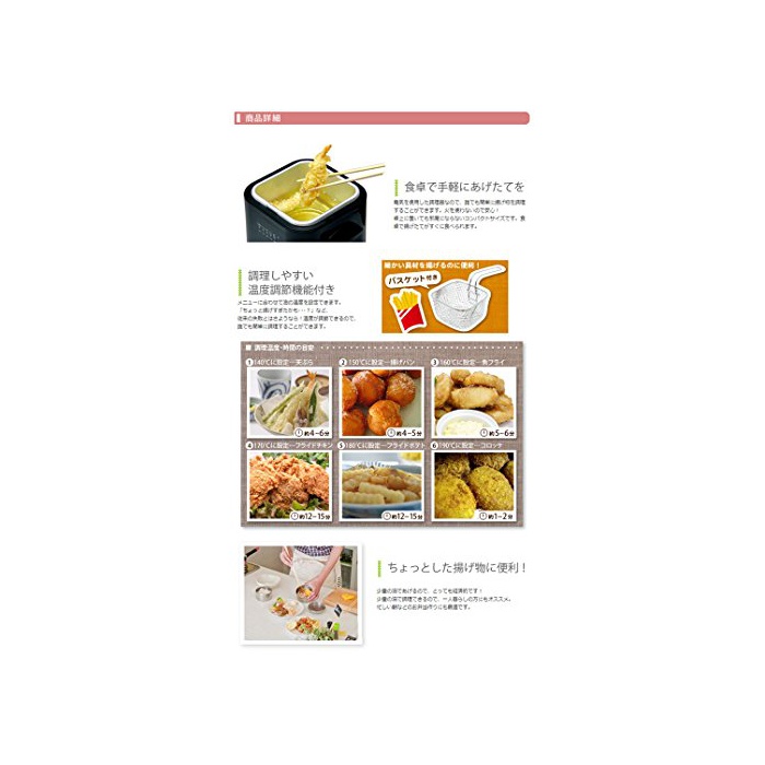 【사양】 본체 사이즈:약W25×D19.5×H19.5cm(뚜껑 사용 시) 본체 중량:약1.2kg(부속품 포함한다) 정격용량:약1.2L 온도 조절 범위:약140℃~190℃ 온도 퓨즈:192℃ 케이블의 길이:약85cm 전원:AC100V 50-60Hz 재질:PP,알루미늄,스테인레스