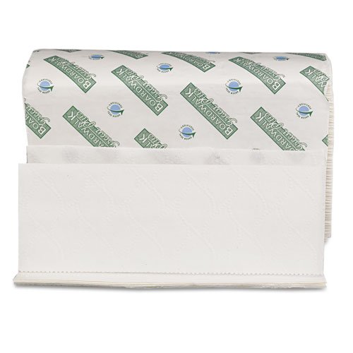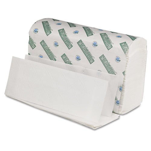 The Boardwalk 23GREEN multi-fold paper towel is 9.5" long by 9.125" wide and Green Seal certified for less environmental impact than standard paper towels, and is for general-purpose cleaning applications. It is made from 100% recycled paper, which contains up to 43% post-consumer waste and exceeds the EPA (Environmental Protection Agency) standards for post-consumer wastepaper products. It has a soft, embossed texture and a bright white color. Its multi-fold design makes the towel easy to stack and unfold. Pack contains 250 towels.