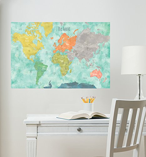 This beautiful world map looks to have been drawn in watercolors. A vibrant palette lends beauty to this peel and stick decal that can easily be repositioned as well as removed. Create a stylish focal point in your room with this dazzling wall decal that can also be used as an educational tool. Measures 24" x 36" and is not dry-erasable.