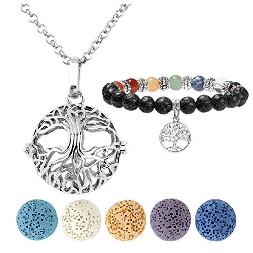 Top Plaza Aromatherapy Essential Oil Diffuser Necklace Silver Locket Pendant With 5 Dyed Lava Stones & Lava Stone Chakra Bracelet