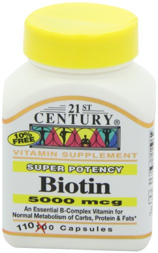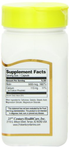 -. Binding : Health and Beauty -. Brand : 21st Century -. Label : 21st Century -. Manufacturer : 21st Century -. ProductGroup : Health and Beauty -. ProductTypeName : HEALTH_PERSONAL_CARE -. Publisher : 21st Century -. Studio : 21st Century -. Title : 21st Century Biotin 5000 Mcg Capsules, 110-Count