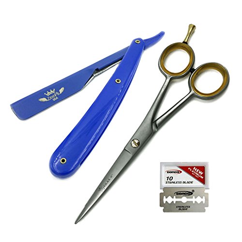 Tijeras 6" Hair Cutting Shears Set With Barber Razor Shavette Full Blue10 Dorco Blades Hairstyling shears Combo Kit Cosmetology School Barber Beauty set Serrated Edge Right Handed