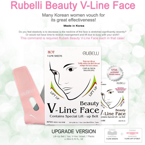 -. Binding : Misc. -. Brand : RuBelli -. Color : White -. EAN : 8809154986510 -. Feature : 'KORADE' is the Authorized Distributor by RuBelli / Achieve lifted V shaped face with Korean's hottest beauty product Rubelli Brand New. / Package includes: 7x V-Line Facial Sheet, 1x Neoprene Face Lift Belt / Face of the V line brightly surface sharp. Easy of use anywhere. / New Upgraded Version! Made in Korea -. Label : Rubelli -. Manufacturer : Rubelli -. PackageQuantity : 1 -. ProductGroup : Beauty -. ProductTypeName : BEAUTY -. Publisher : Rubelli -. Studio : Rubelli -. Title : Rubelli V Line Facial Mask Sheets Face Lift Up Chin Neck Wrinkles Reduce Packs - 7pcs Sheets with 1Belt