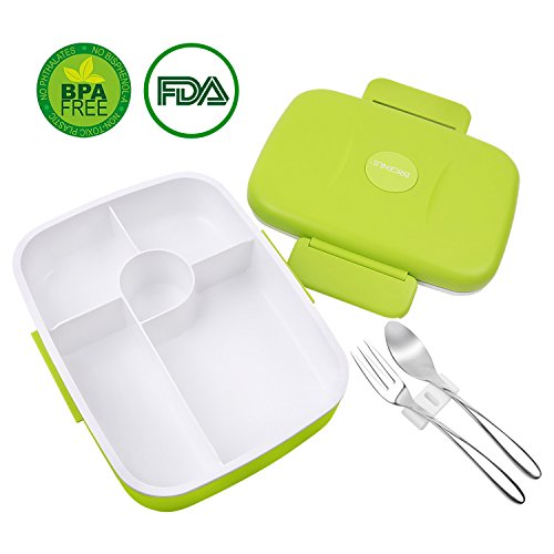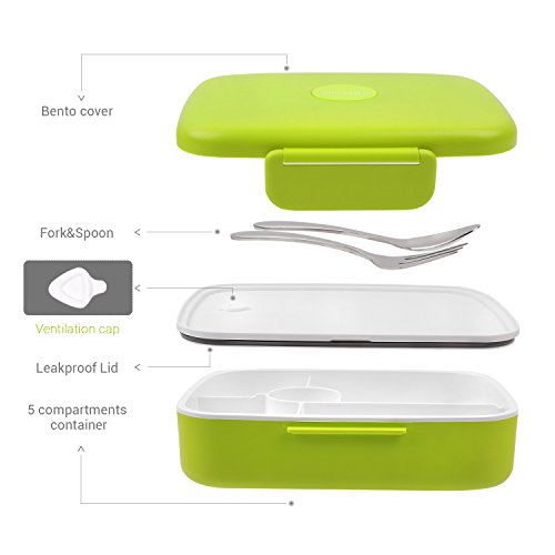 Bento Lunch Box For Kids Adults W/5 Compartment, Leakproof, Microwave Dishwasher Safe, Healthy BPA Free (Fork & Spoon INCLUDED)