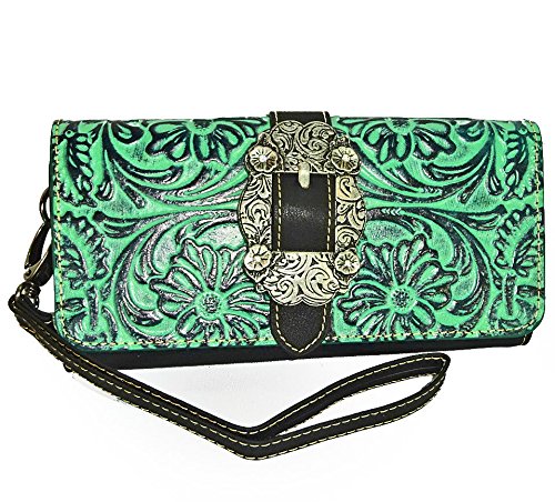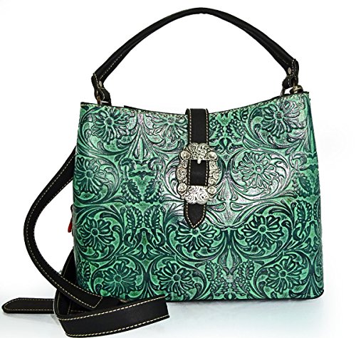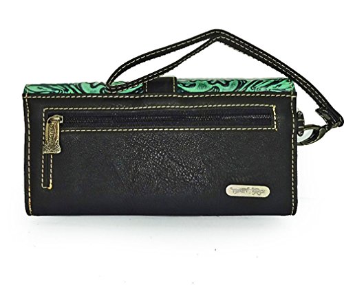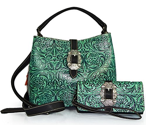 Trinity Ranch Tooled Floral Leather Bucket Tote w/ Crossbody Strap + Wallet- Blk/TQ