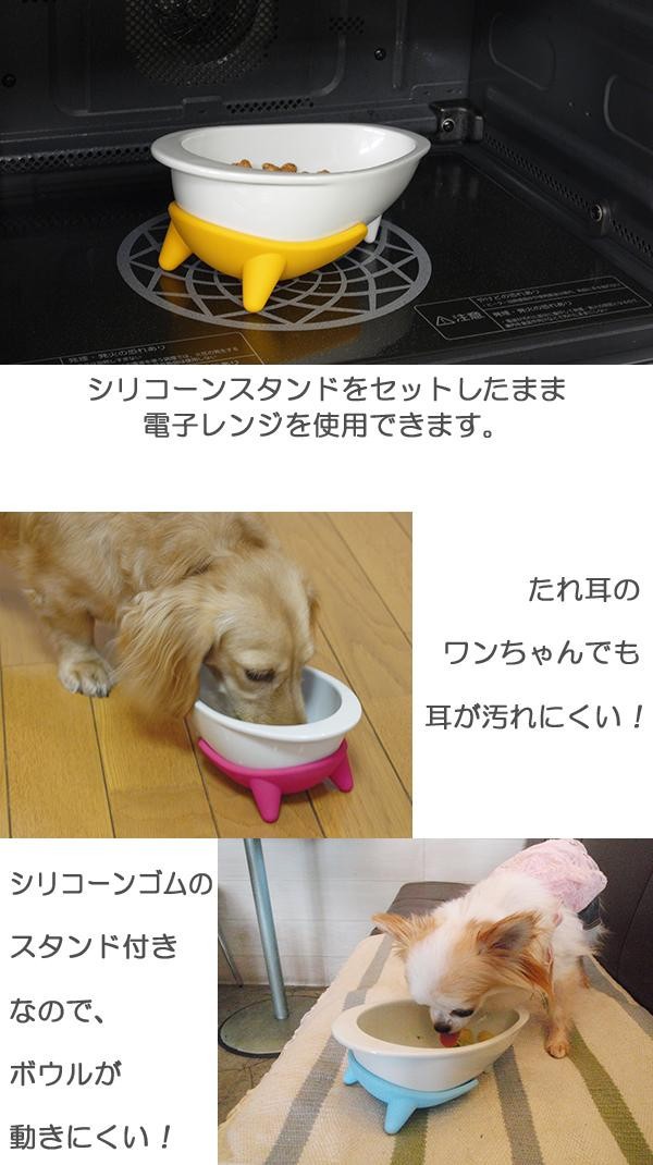 ミニチュアダックスフンドやトイ・プードルなど、鼻の長い犬が食べやすい形状を追求しました。シリコーンスタンドをセットしたまま電子レンジを使用できます。 |