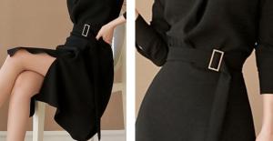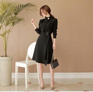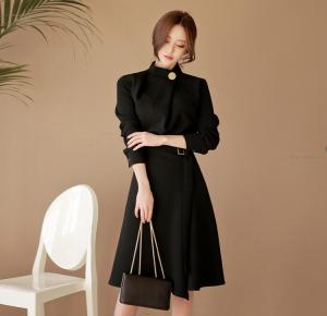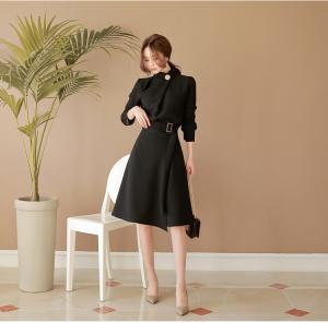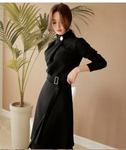 膝丈ワンピース スリット ハイネック ウエストマーク リボン フォーマル ベルト付き ボタン