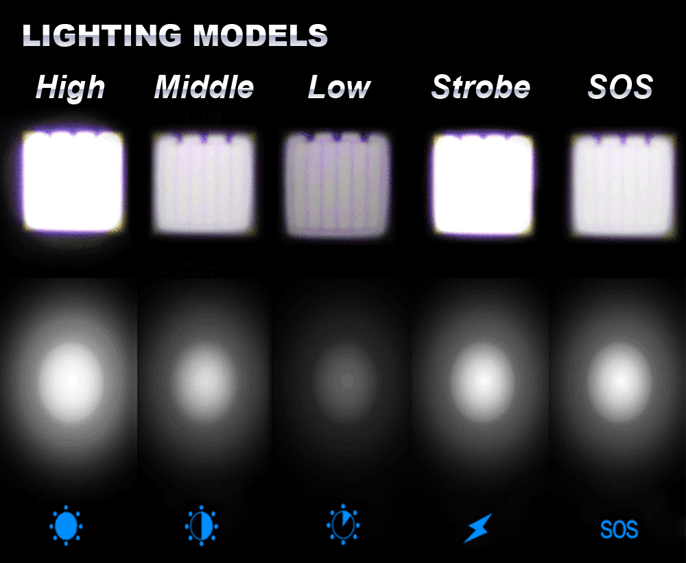 5-mode lighting: high, middle, low, strobe and SOS.