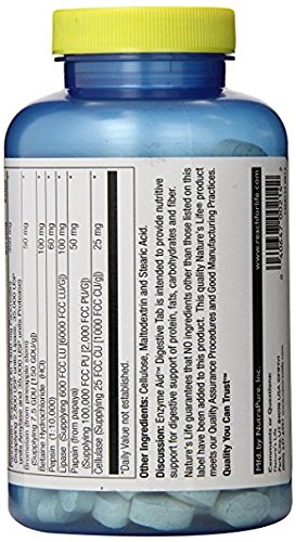 Studio : Nature's Life Publisher : Nature's Life Binding : Health and Beauty Product Description Enzyme Aid Digestive Tablets are specifically formulated to aid in the digestion of carbohydrates, fats, and proteins. Nature's Life combines Pancreatin, Ox Bile, Pepsin, Lipase and other substances which may enhance the digestive process. Improper digestion of nutrients can lead to malnutrition and indigestion. Nature's Life Enzyme Aid Digestive may prevent bloating and flatulence, heartburn, and epigastric pain. By providing the body with enzymes and acids essential to healthy digestion. Enzyme Aid Digestive Tablets may not only prevent but relieve indigestion, this product may also promote the body's ability to efficiently absorb nutrients. 0