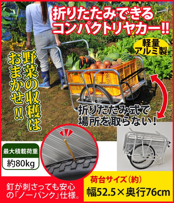 コンパクトサイズで扱いやすく、重い荷物もラクラク運べる便利なリヤカー。小回りも利くから農作業からアウトドアまで大活躍!!折り畳み式なので収納場所を取らず、車の後部にスッポリ積むことができます。 |