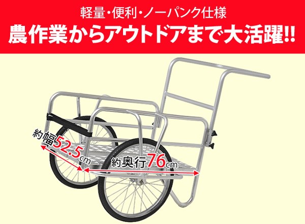 | 仕様 | 荷台:約幅52.5×奥行76cm 最大積載荷重:80kg タイヤサイズ:20インチノーパンクタイヤ 一部組立式 |