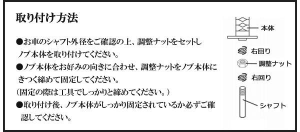 | 仕様 | 適応車:ゲート式AT・コラム式AT・MT車 適合シフトサイズ:Φ10mm(ピッチ:1.25) |