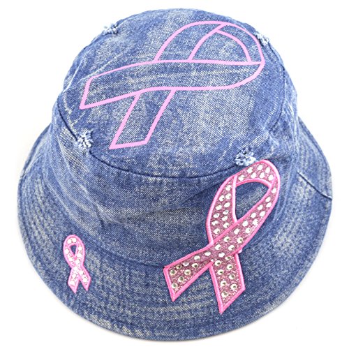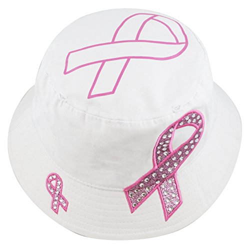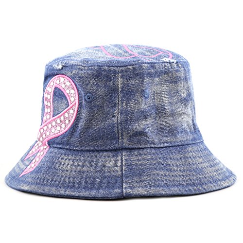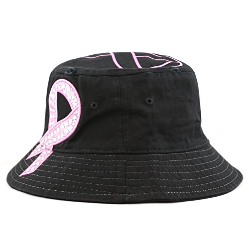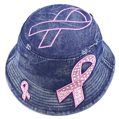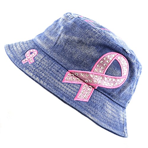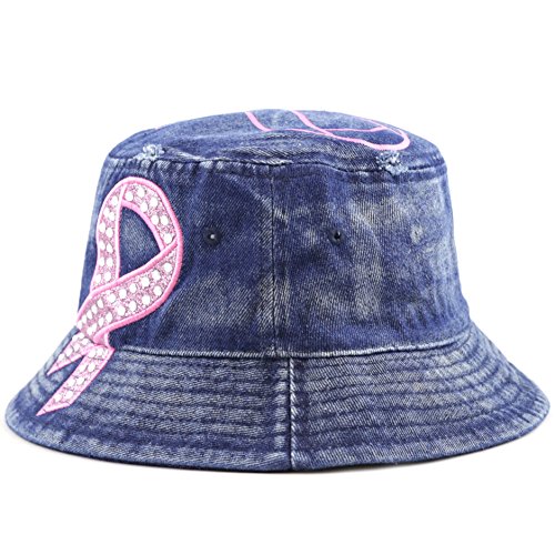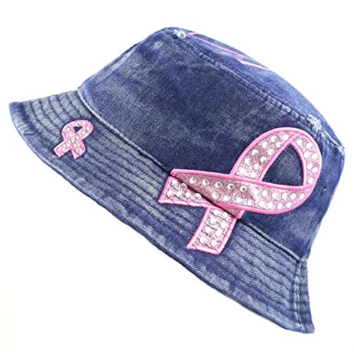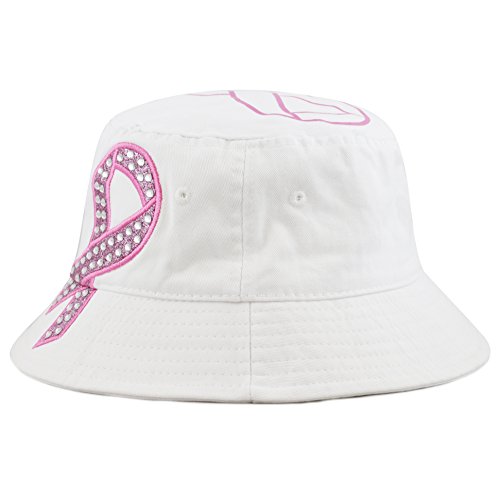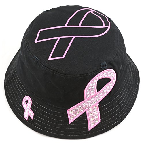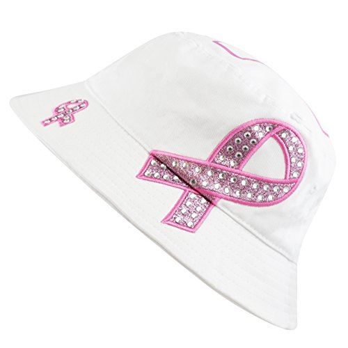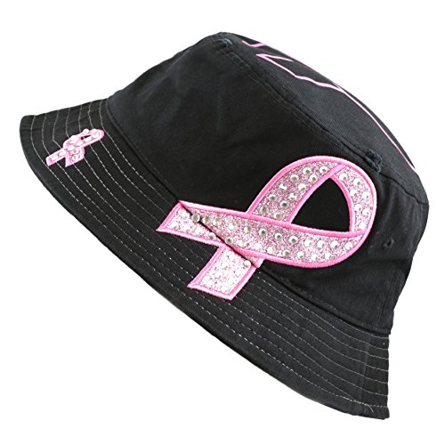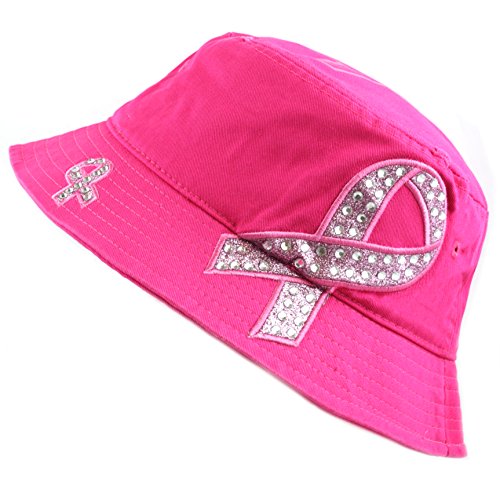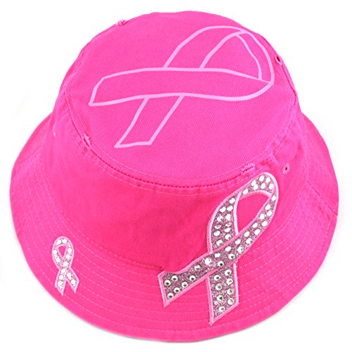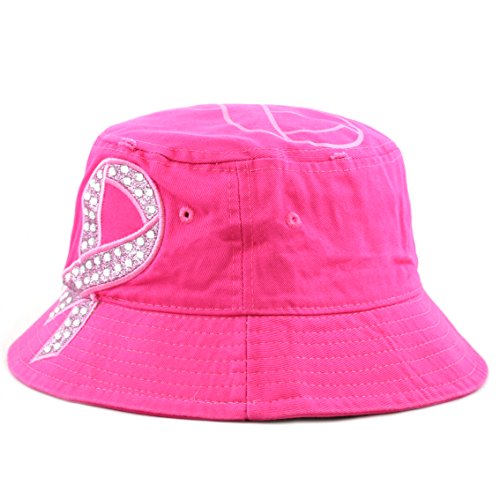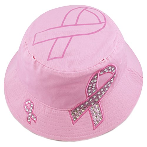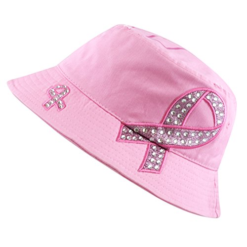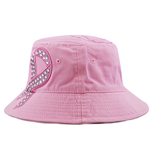 The Hat Depot 1100P Women's Beaded Shiny Rhinestone Pink Ribbon Bucket Hat