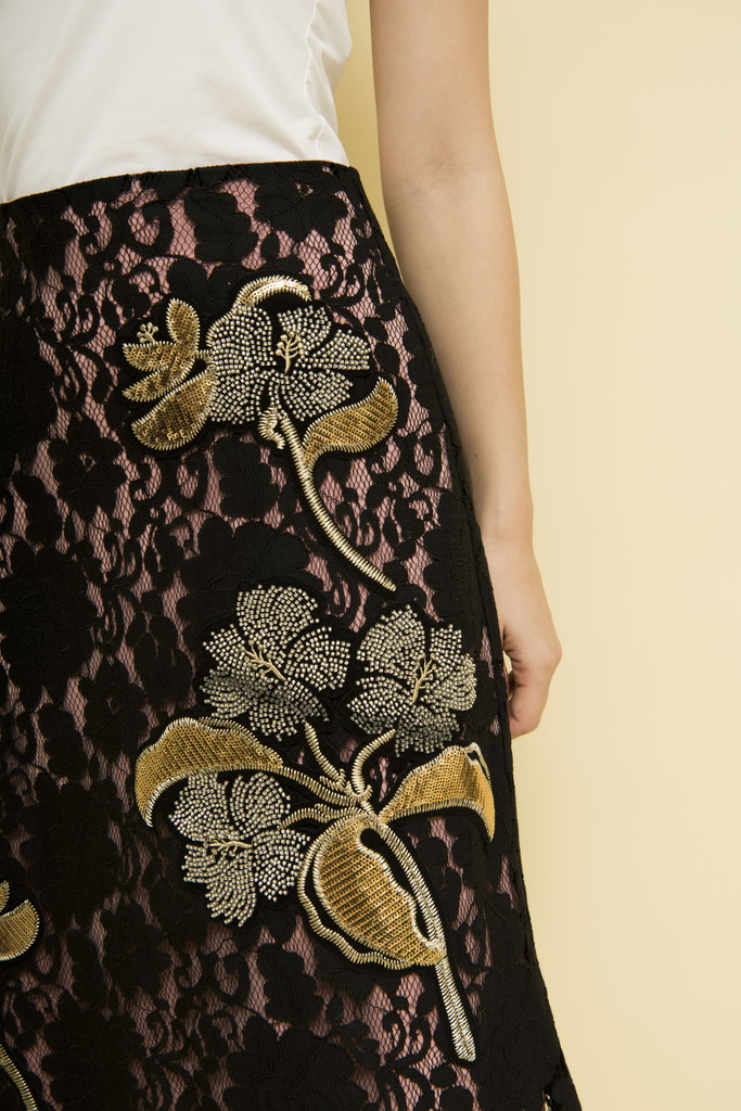 Playfulなアイテムを提案ビーズを使用したシックな花柄モチーフを大胆に施したレーススカート。
