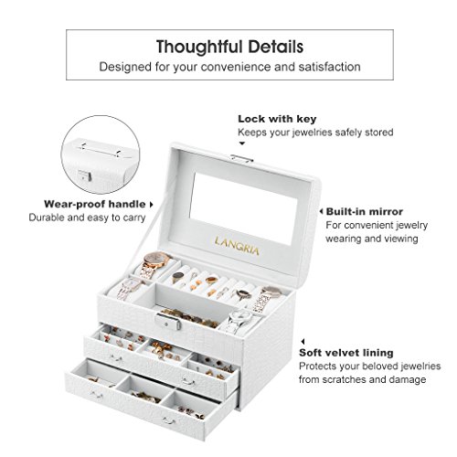 Studio : LANGRIA Publisher : LANGRIA Binding : Kitchen Product Description The piece of elegance missing in your decor LANGRIA's white faux leather crocodile patterned jewelry box is both, a great makeup and accessories organizer and a fashionable and modern piece of decoration for your bedroom, bathroom, dressing room and more. The beautiful white finish and delicate lines of this jewelry case, make it very easy to combine with the rest of the decor style. Keep your favourite pieces organized and at reach at any time!