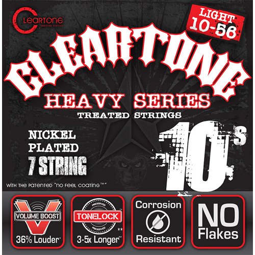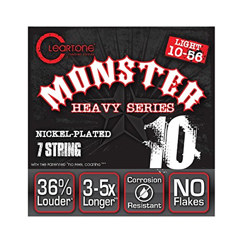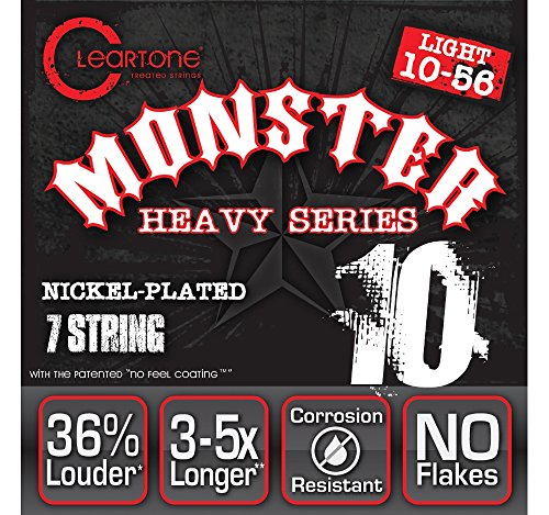 Studio : Cleartone Publisher : Cleartone Product Description Designed specifically for alternative tunings such as Drop D, Drop C and Drop C#, Cleartone Monster Heavy sets feature heavier gauge strings for that extra tension you need perfect for djent, metalcore, post-hadcore or any other core you can think of. At one micron thin, the "No Feel Coating" EMP Treatment is then applied to all 7 strings to ensure longest tonal life without compromises. Monster Heavy Series are heavy duty, but with 3-5 times the lifespan. 0