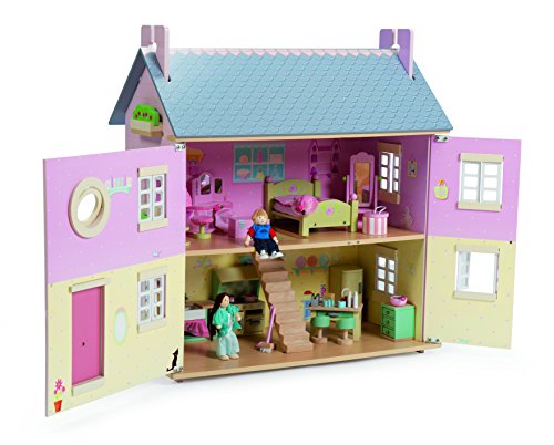 • Wooden pink 3 story dollhouse, with front wall that opens for easy access