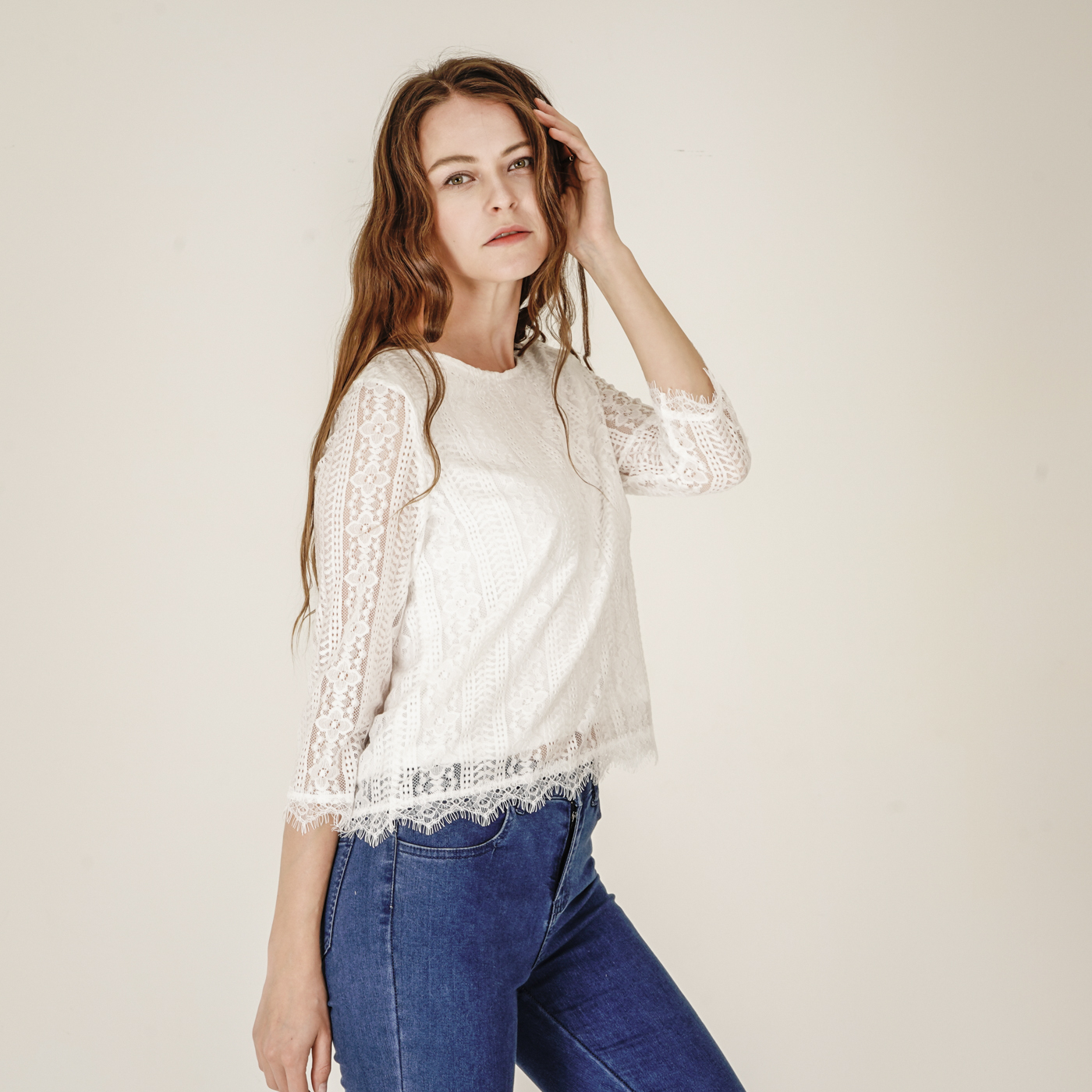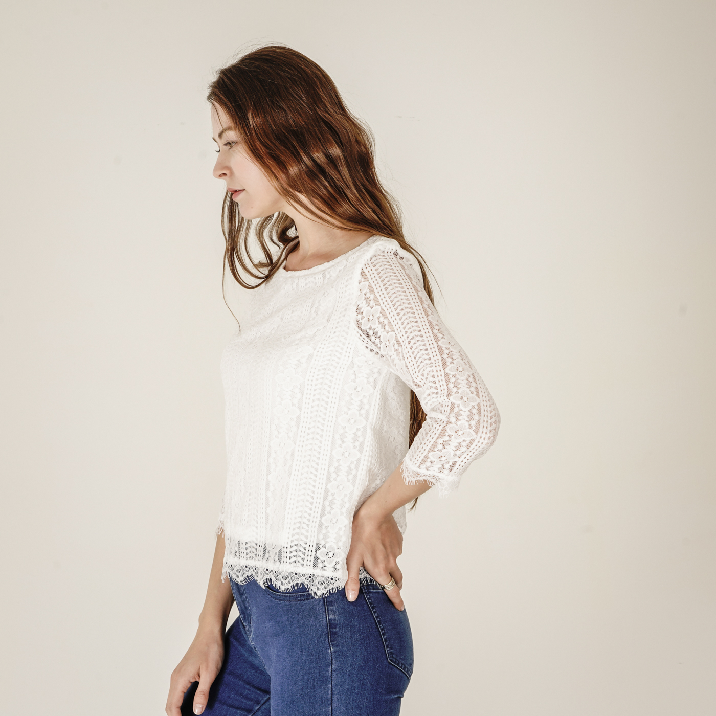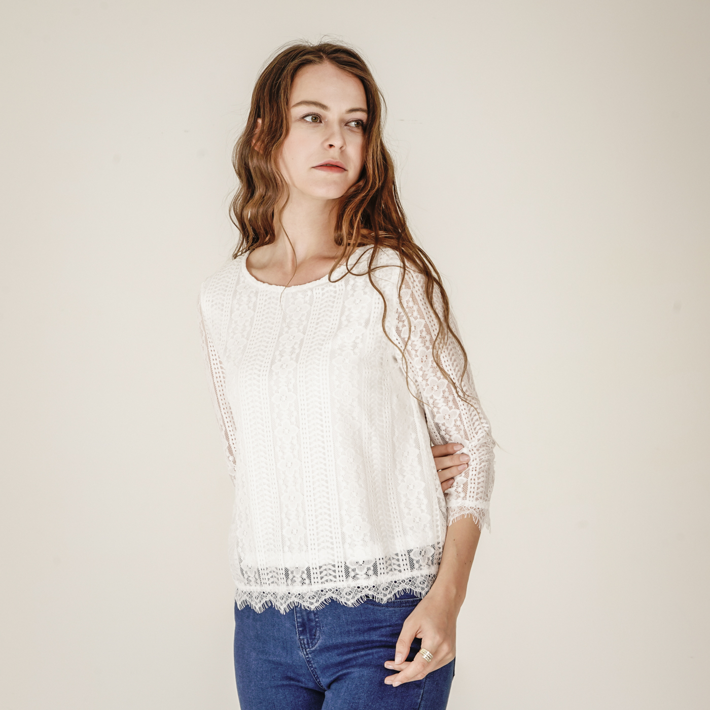 레이스패턴이 예쁘고 여성스런 편하고 귀여운 크롭 스타일의 탑입니다.