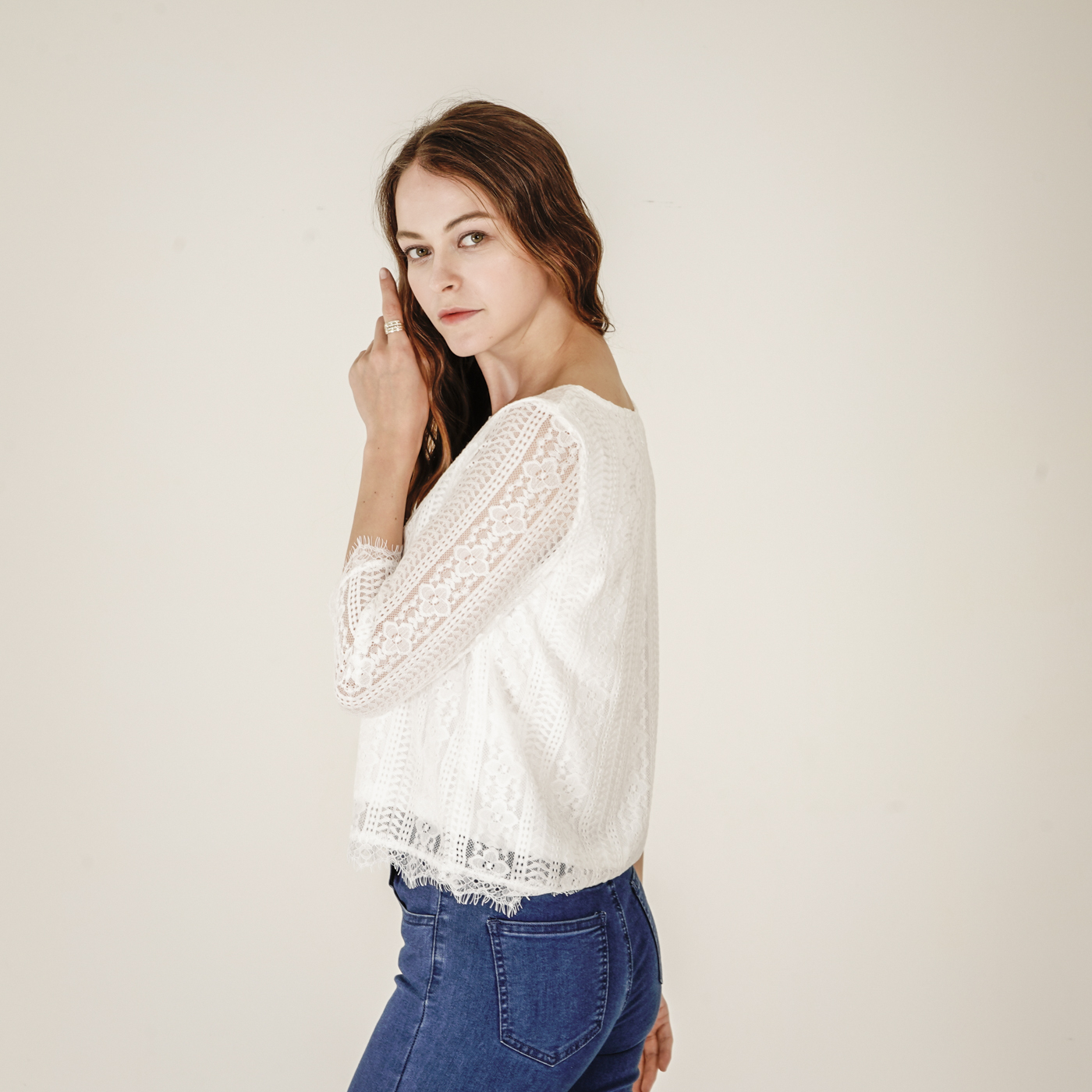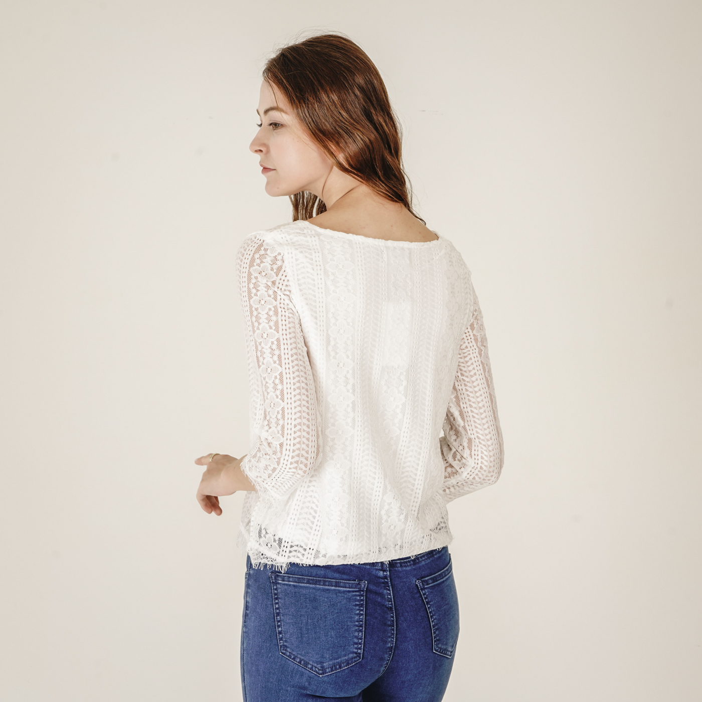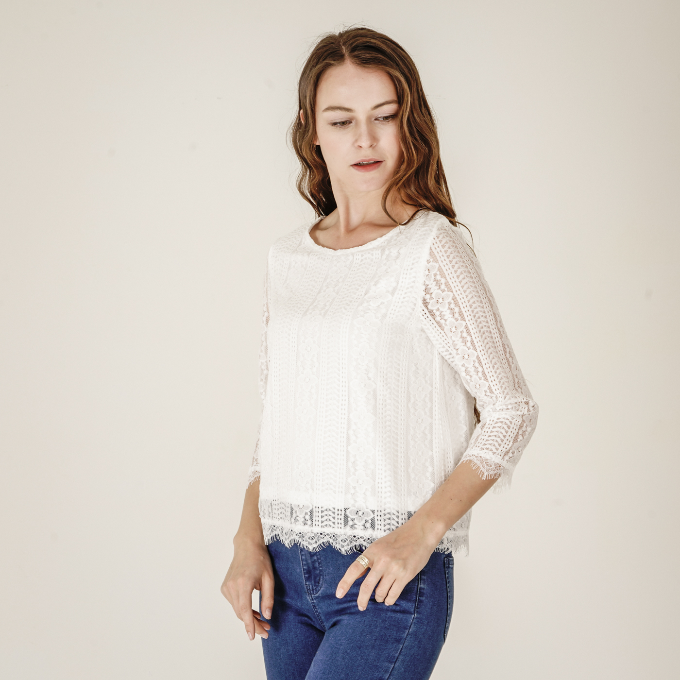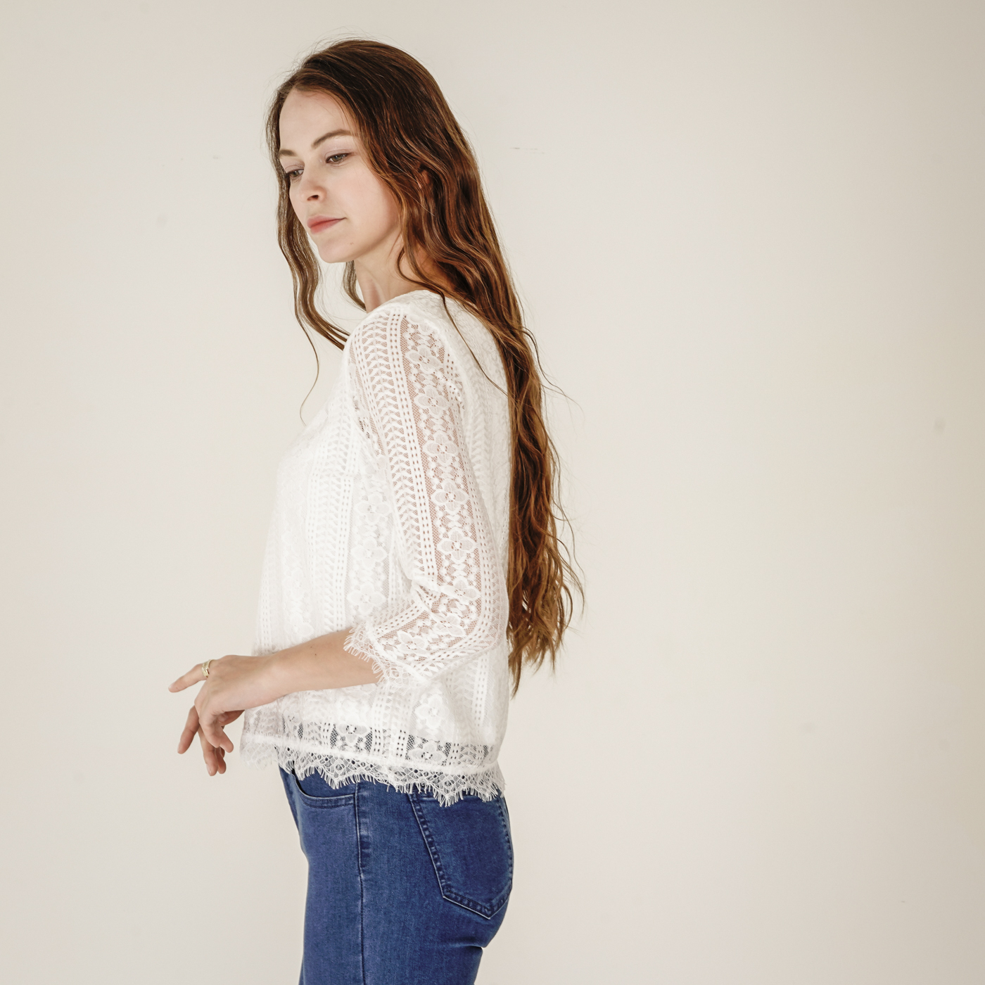 레이스패턴이 예쁘고 여성스런 편하고 귀여운 크롭 스타일의 탑입니다.