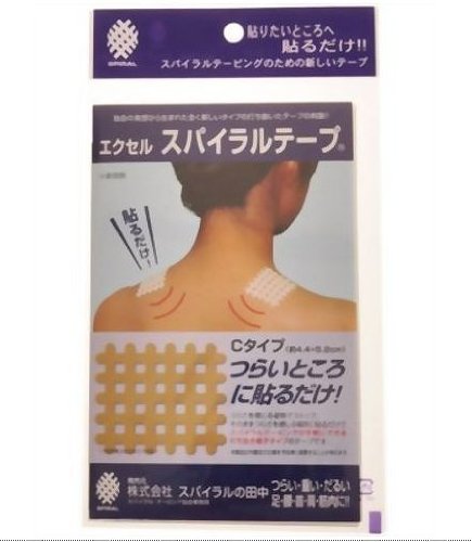 「エクセルスパイラルテープCタイプ(約4.4*5.2cm)」は、そのままつらさを感じる場所に貼るだけで、スパイラルテーピングができる打ち抜き格子タイプのテープです。お肌にやさしくソフトで、優れた粘着性があります。ミシン目から1枚ずつ切り離し台紙の切れ目より簡単にはがして貼れます。貼ったままお風呂に入れます。