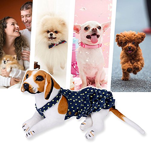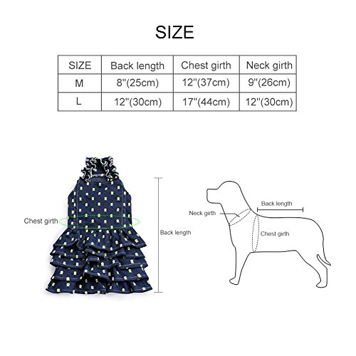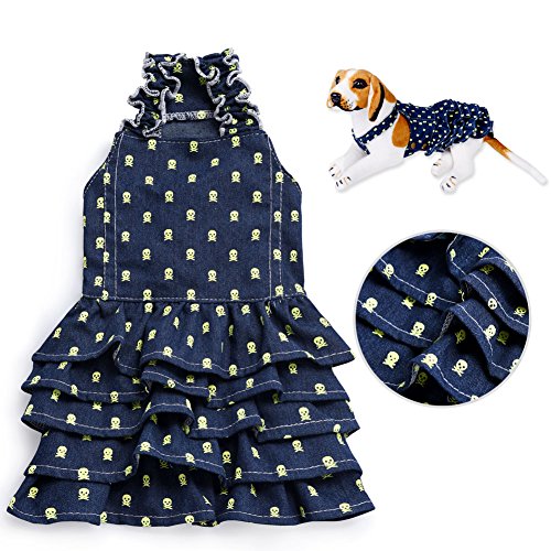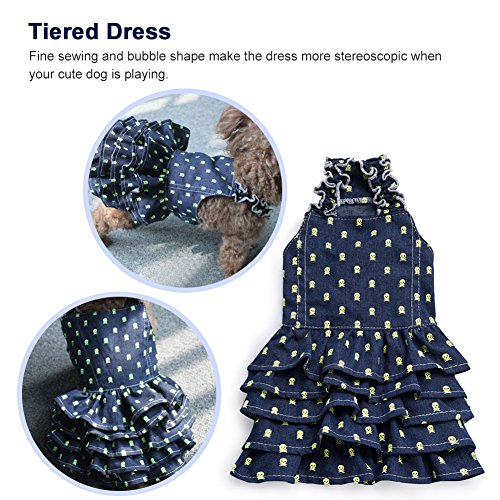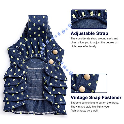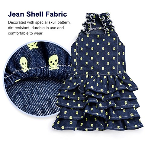 -. Feature : Durable Jean Fabric- Wearable and dirt resistant in daily wear. / Vintage Snap Fastener- Convenient to put on and take off. / Elastic Cord- Not readily to cause bound feeling, extreme comfortable to wear. / Tiered Dress Design- Delicately crafted with multiple layers, makes your loved pet become the elegant princess. / Suitable Application- Walking playing, gathering, etc. (Specially designed for small dogs, like Teddy, Pomeranian, Chihuahua, etc.