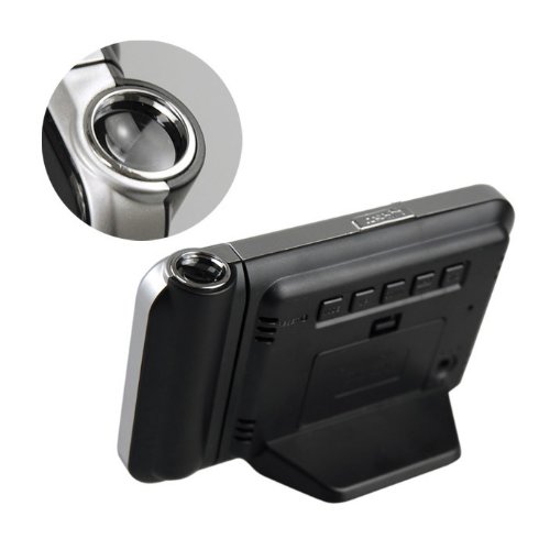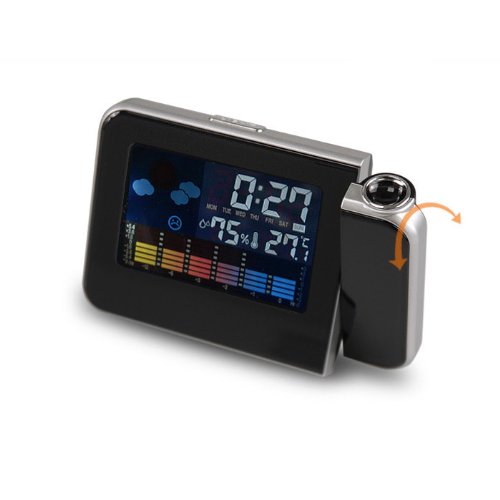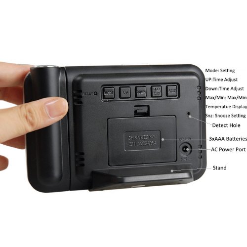 - Feature : Projection time function (180° swivel) / 12/24 format hour / Calendar (2001 - 2099 year) / Max/Min temperature and Humidity records / Alarm/snooze function