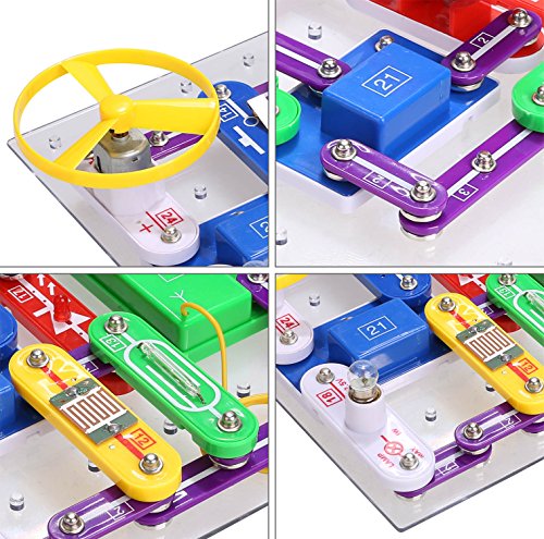 -. Feature : Build 335 experiments with 31 parts.Make kids hands-on experience designing and building models of working electrical circuits / Experiments included: Hand, Light, Magnet, Voice, Water, Motor, Touth controlled, Function: Flash, sound, power, recording / Comes with project manuals that include large color illustrations and simple directions for each project. / Battery:Need 2 x AA batteries (not included) / The toy set can be used to make interesting circuits, encouraging educational play that teaches your kids about electricity.It will be a better gift for your kids to learn the science and physical.