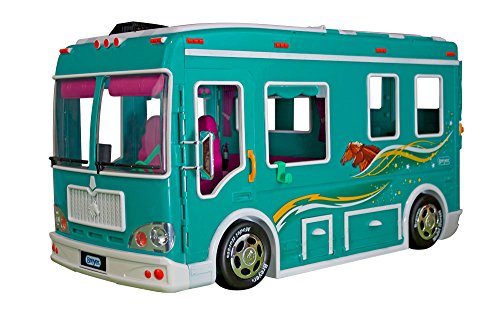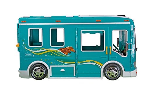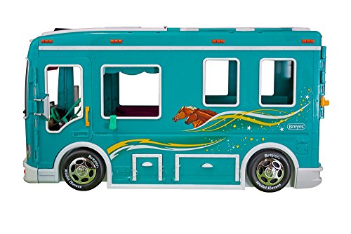 Breyer's Horse Cruiser is the ultimate vehicle for your Breyer Classics horses and riders! Featuring a new updated look with a snappy teal exterior and bright raspberry seating, the Classics Cruiser will make sure horses and riders get to their next horse show or riding adventure in comfort and style! Every horse-loving kid's dream vehicle, the Classics Cruiser is packed with exciting features that will inspire endless hours of creative horse play - at home or on the move! Features: -Two horse stalls with planked floors feature hidden storage for supplies underneath the floor! - Tailgate drops down to become a loading ramp, and has top Dutch doors that open and close - Roof opens for additional access to the trailer area, and has a fold-out awning for shade -Water trough and feed bin make feeding horses on-the-go easy -Tack hooks fit on the window ledges for hanging tack and other equipment -Two swiveling front seats have storage pouches and seat belts for safety. Seats fit 6" dolls -Steering wheel slides for international trips, and license plate has 3 positions - Visors to block the sun, dashboard GPS, and adjustable side mirrors - Rear seat slides forward to form a bed, has cup holders, a pop-up table, and pull-down steps - Roof doubles as an observation deck complete with flat screen TV and a fold-out table - Roof's compartment stores a ladder and two deck chairs Includes: Cruiser, 1 ladder, 2 chairs, 6 tack hooks, 1 water trough, 1 feed bin.Feature