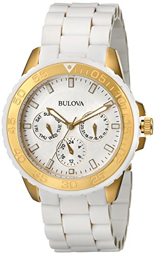 Casual watch, Japanese quartz movement, Multifunction featuring 24-hour, day and date subdials, Polished gold-tone hands with luminous accents, Polished gold-tone sweep seconds, Polished gold-tone hands mark subdials, Applied luminescent polished gold-tone hour markers, Black print, Arabic numbers and indices mark subdials, Black indices form minute track, Matte silver-white dial with argyle pattern and black logo, Polished gold-ion-plated stainless steel bracelet wrapped in matte white silicone with adjustable links and push-button-clasp, Matte white silicone bezel with polished gold-ion-plated stainless steel top ring and engraved Arabic numbers/indices, Oversize polished gold-ion-plated stainless steel round case, Textured gold-ion-plated steel crown with engraved logo, Stainless steel screw-down caseback, Mineral crystal, 5 ATM (50 meters/165 feet water resistant)Feature