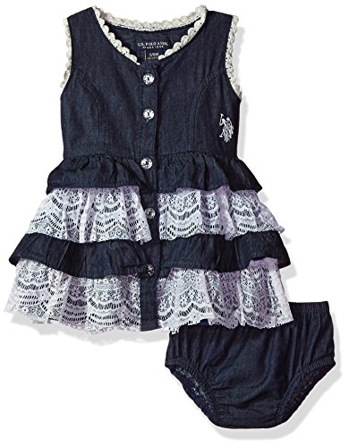 -. Binding : Apparel -. Brand : U.S. Polo Assn. -. Department : baby-girls -. Feature : Rhinestone buttons in front / Scallop lace edging / Iconic logo -. Label : US Polo Assn. Children's Apparel -. Manufacturer : US Polo Assn. Children's Apparel -. Model : KU78 -. PackageQuantity : 1 -. ProductGroup : Apparel -. ProductTypeName : DRESS -. Publisher : US Polo Assn. Children's Apparel -. Studio : US Polo Assn. Children's Apparel -. Title : U.S. Polo Assn. Baby Girls' Denim Tank Dress with Empire Waist Ruffles