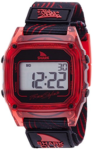 Japanese quartz digital movement with standard digital functions (day/time/date, alarms, countdown heat timer, chronograph and night vision backlight, durable polycarbonate case and hydro pushers which can be pushed underwater