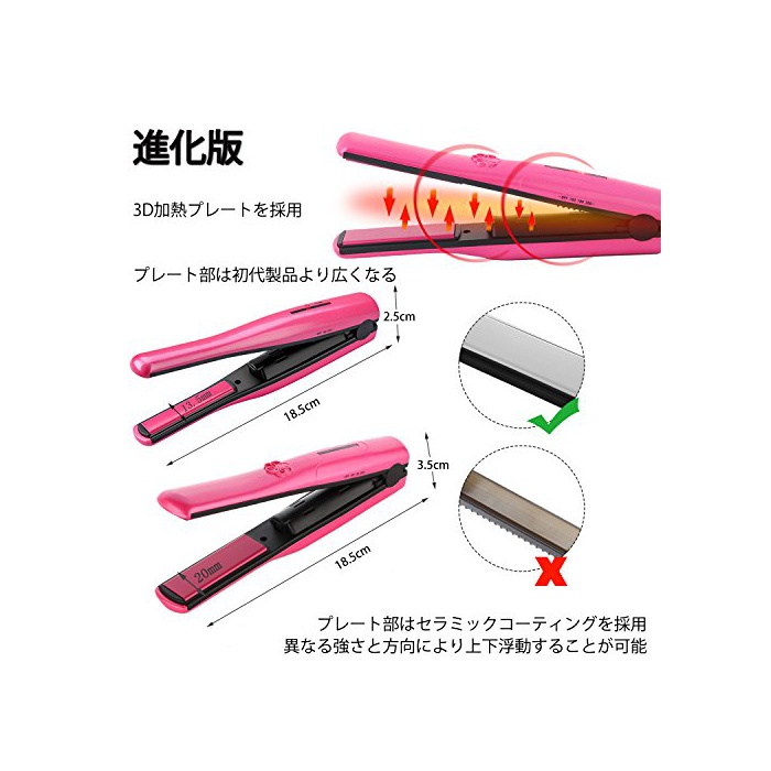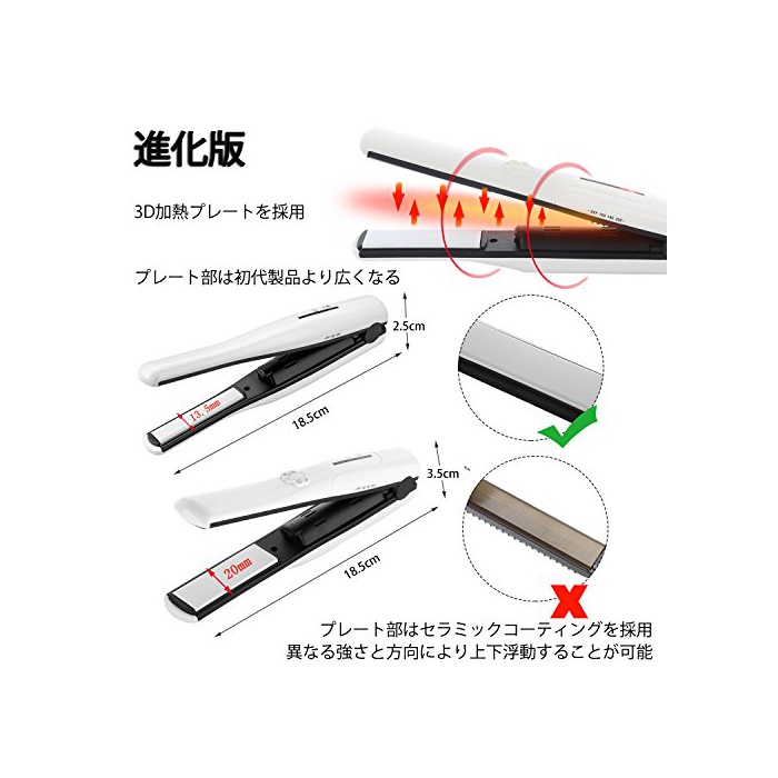 【진화판 세라믹 코딩】초대 제품 보다 넓은 세라믹 코팅 플레이트를 채용했습니다.열《무라》가 되지 않는 양면 가열 할 수 있는 고품질의 세라믹에 티타늄 플레이트는 머리의 수분 증발을 경감하여 데미지를 최소한으로 억제해 윤기도 줍니다.전혀 머리를 손상시키지지 않습니다.