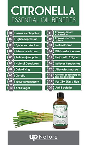 -. Feature : PREMIUM QUALITY CITRONELLA OIL - 100% pure, gentle and effective natural citronella essential oil from organic source. No toxins, additives. Unfiltered and undiluted. Therapeutic grade. Steam distilled. Non GMO. Packaged & bottled in the USA. / YOU DESERVE THE BEST - UpNature was founded by two brothers, with a vision to provide 100% all natural products, for easy, effective & natural solutions for health & well-being, so everybody can live happier and healthier lives. / ALL-NATURAL INSECT REPELLENT - No more insects, bugs & rodents after using citronella oil. It will make them all go away, naturally & peacefully. Applying pure citronella oil directly to the body is considered more effective for fighting bugs than citronella candles are. / NATURAL PERFUME OR ROOM SPRAY: Because it has a clean, fresh scent, citronella is a common ingredient in soaps, candles, incense, perfumes and cosmetics. You can deodorize the scents in your home, dishwasher, refrigerator and laundry machine by diffusing citronella or running a very small amount through a cycle of your household appliances. / 100% RISK FREE PURCHASE: Purchase with complete peace of mind. We offer a full 100% 365 days money back guarantee. If you are not satisfied with Up Nature Citronella Oil, we will refund your entire purchase.