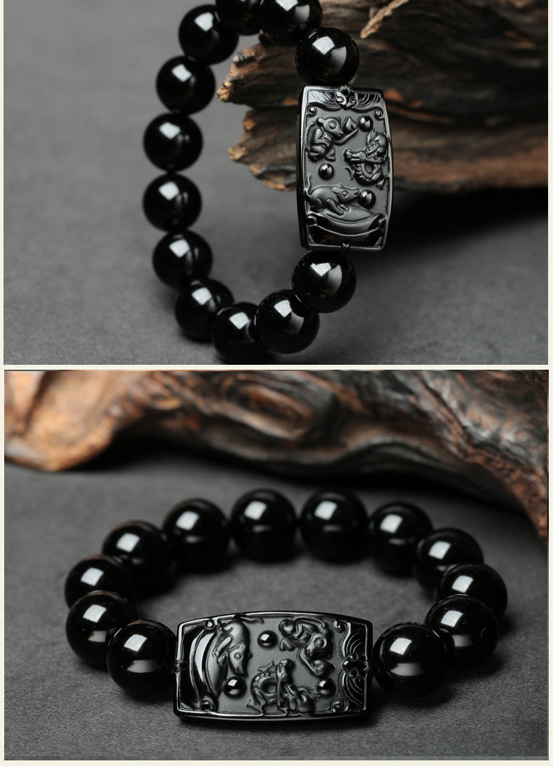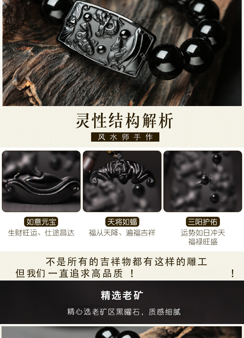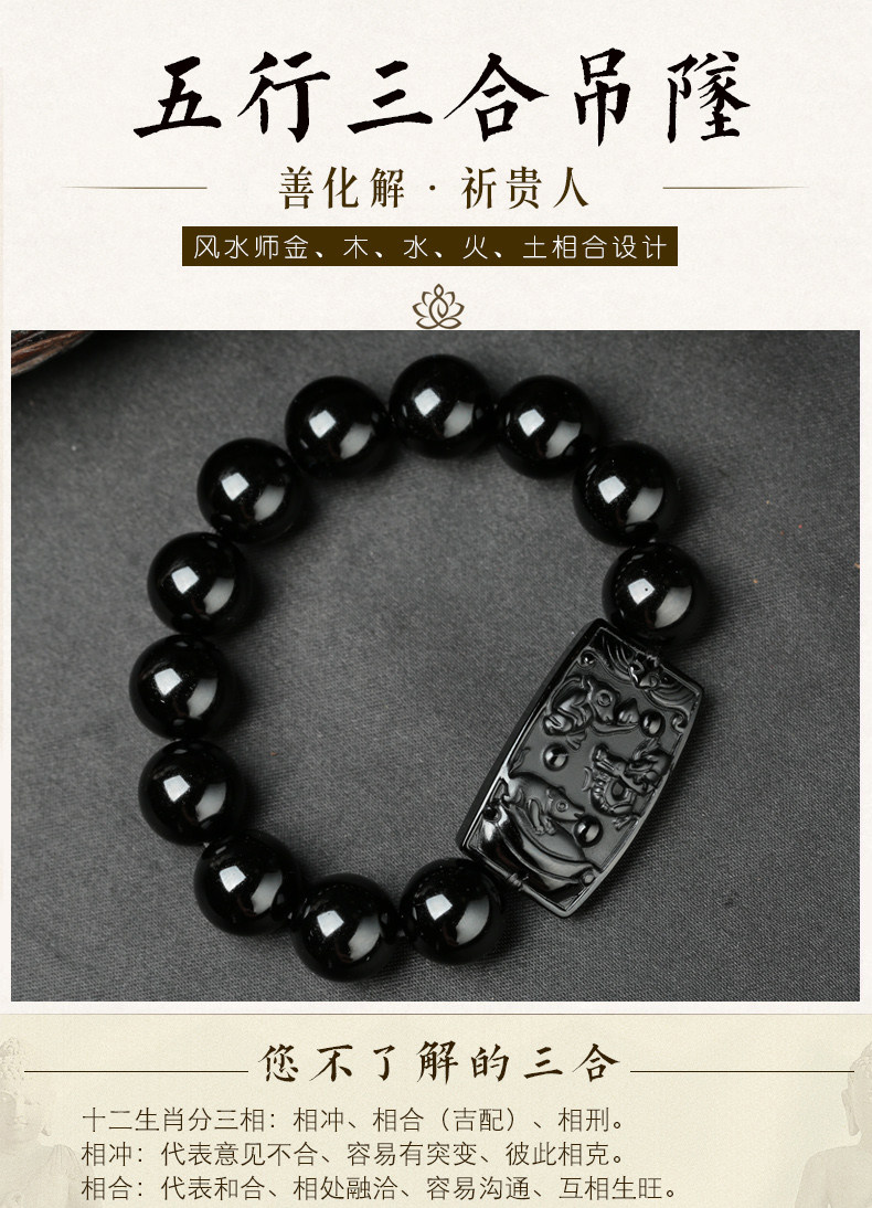 开光乌金黑曜石申子辰三合贵人手链化太岁生肖属猴鼠龙人吉祥物