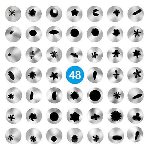 - 48 Frosting Tips: 48 different shapes can meet what you need and spark your ideas and make different types of patterns like lilies, tulips, roses on cakes, fruit muffins, pies, chocolate tarts, etc.